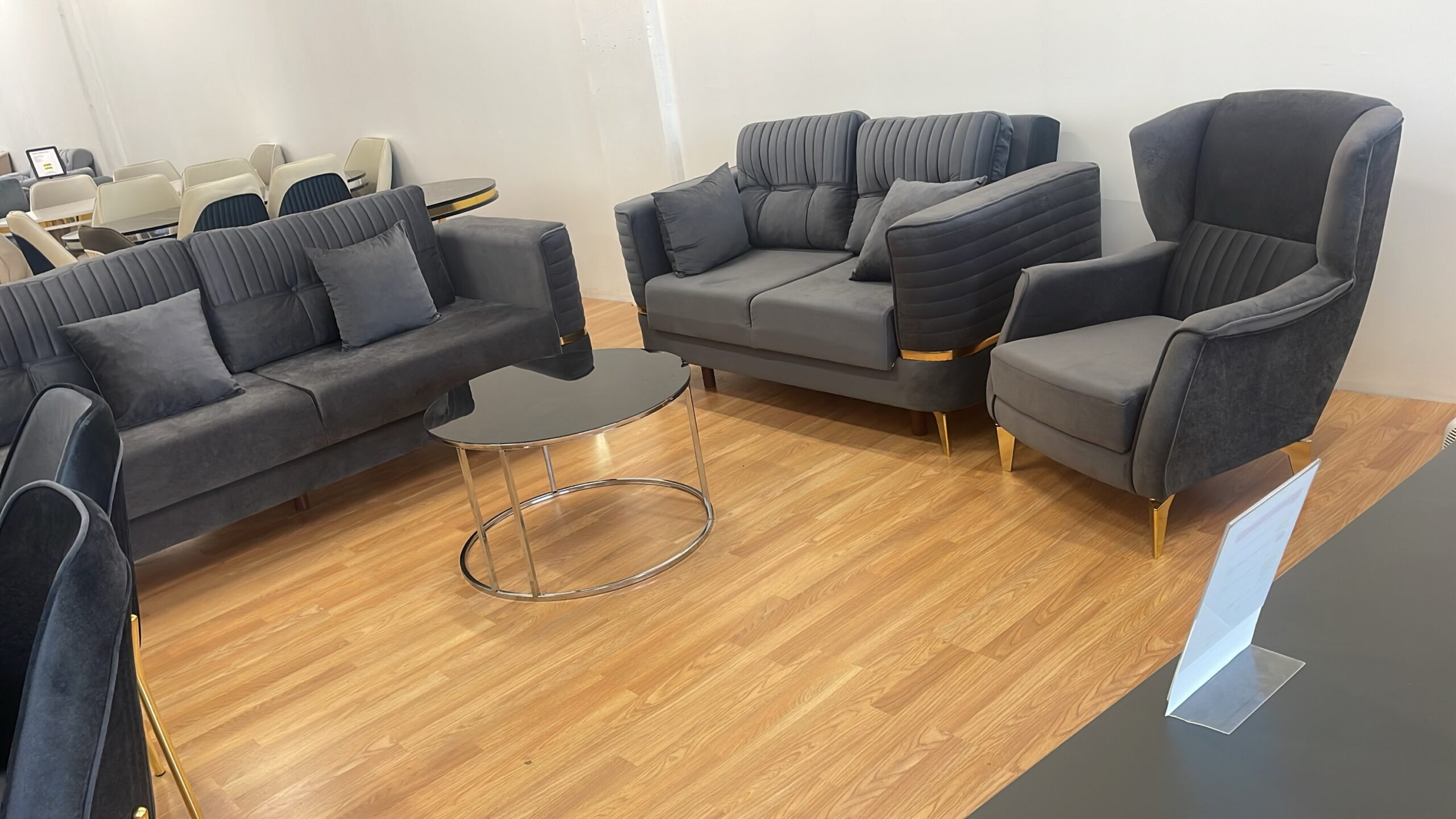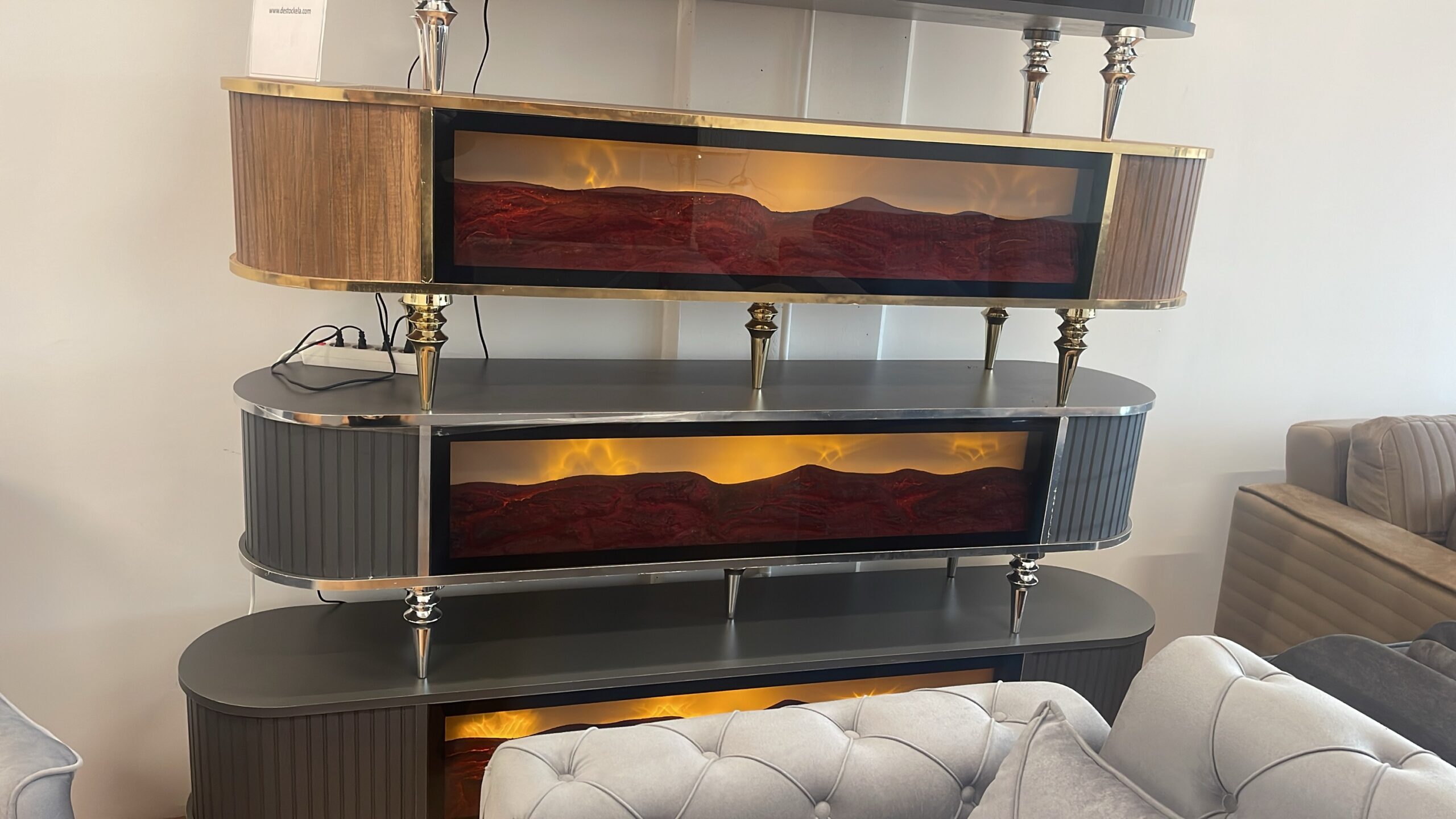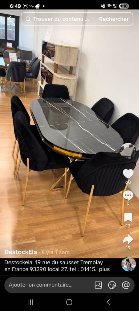 Salon complet LUXE avec canapé 3-2-1 Olivia ou Yasemin + Salle à manger Luxe 6 chaises et une table ovale 170x90cm et un meuble tv cheminée avec la musique 160cm ou 180cm ou 200cm au choix