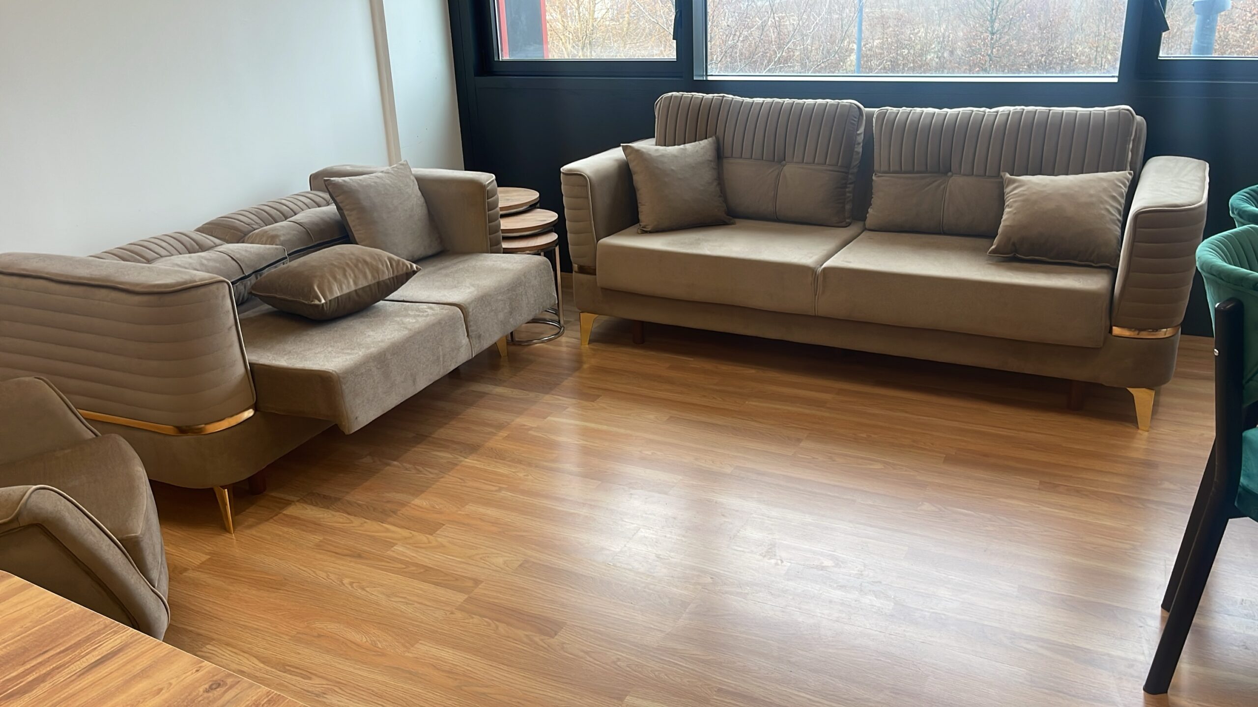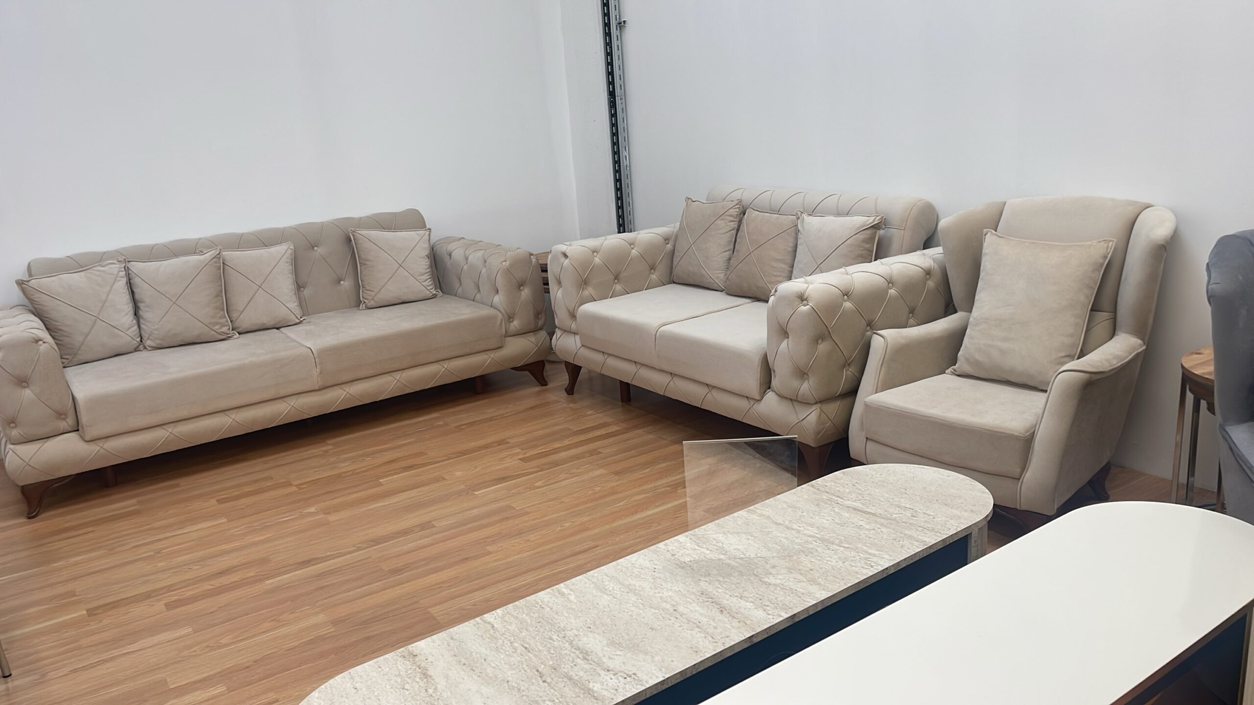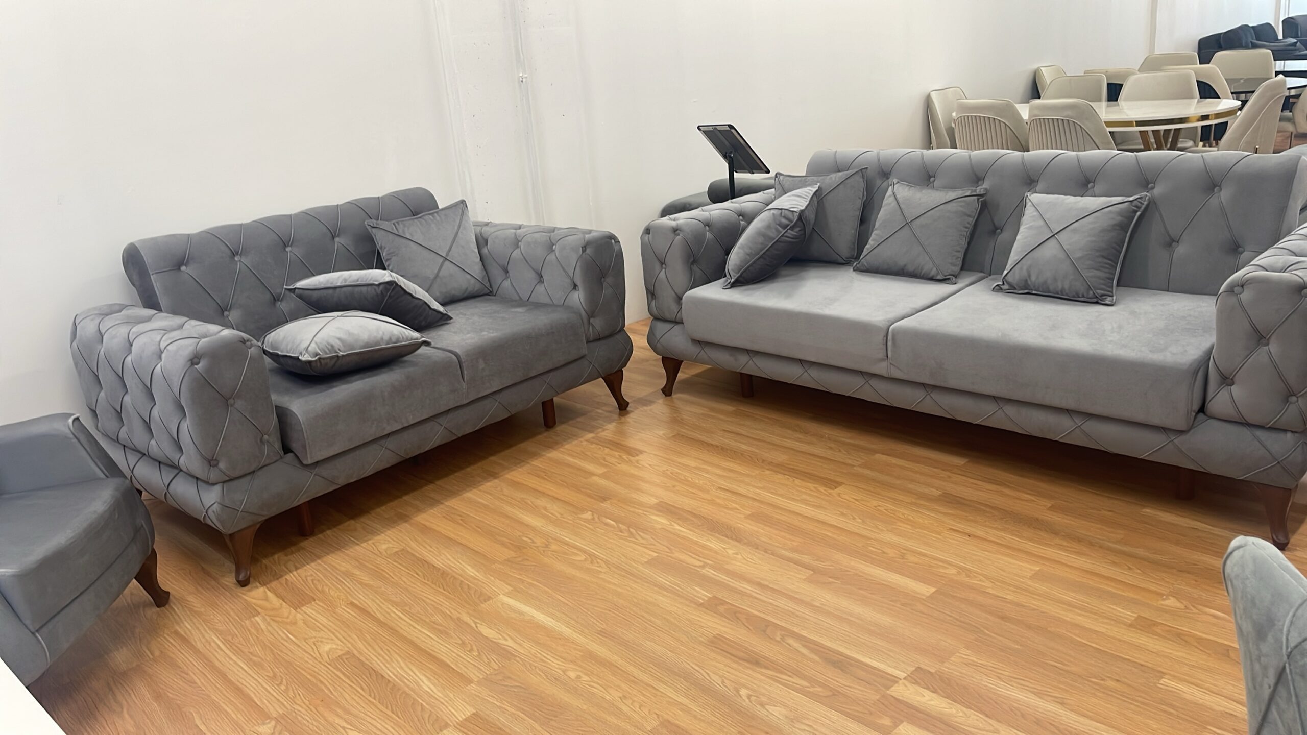 Salon complet LUXE avec canapé 3-2-1 Olivia ou Yasemin + Salle à manger Luxe 6 chaises et une table ovale 170x90cm et un meuble tv cheminée avec la musique 160cm ou 180cm ou 200cm au choix
